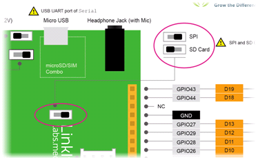 The SPI and built-in SD card functions are exclusive. Before using the SPI API, make sure the settings switch is correctly set (see Figure below). Please note that once the board is configured to SPI, calling SD APIs may result in unexpected SPI behavior.
